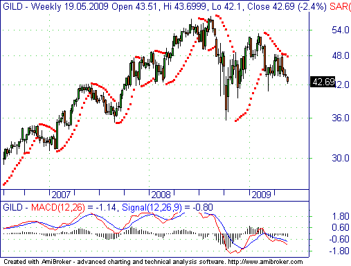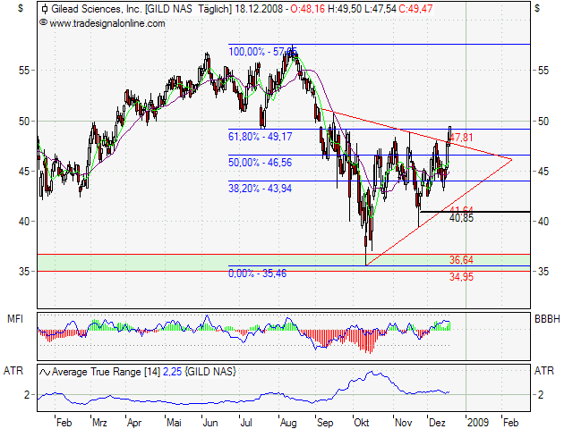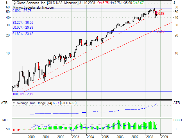gilead scheint in den letzten wochen einen unterstützenden aufwärtstrend auszubilden. der kurs hält sich insgesamt recht robust, warte aber derzeit auf den ausbruch über 46 $. ansonsten kann man nur hoffen, dass die aktie nicht unter die 35 fällt. das riecht dann nach ärger