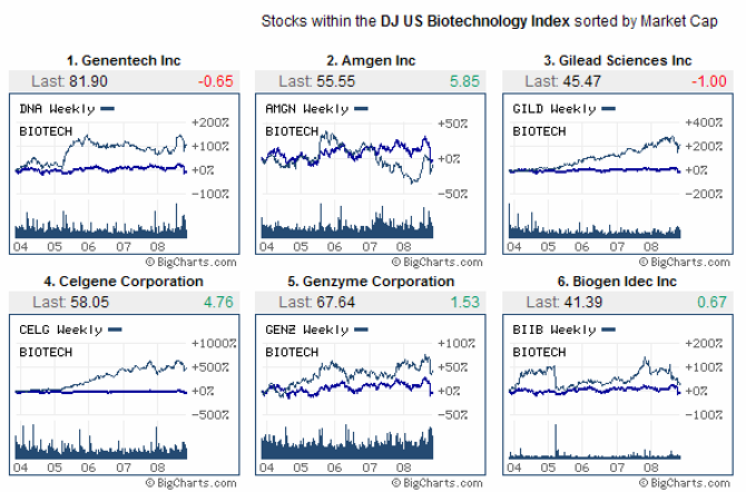 Man erkennt die Ourperformance gegenüber dem US Biotechnology Index sowie die relative Stärke gegenüber den Peers. Lediglich Celgene weist ein ähnlich starkes Chartbild vor.