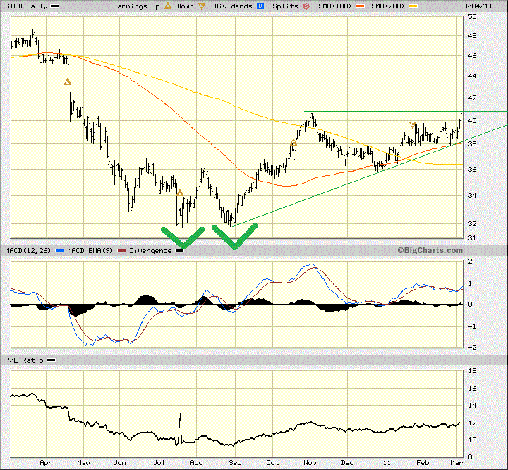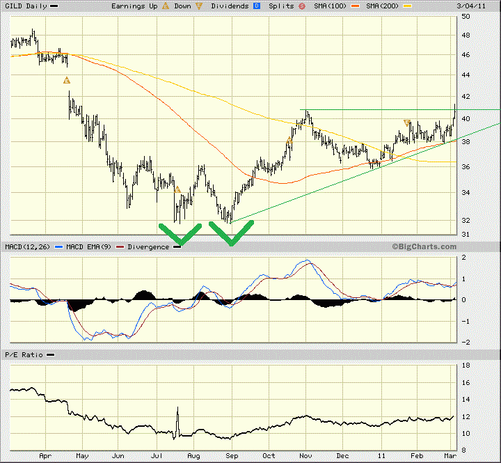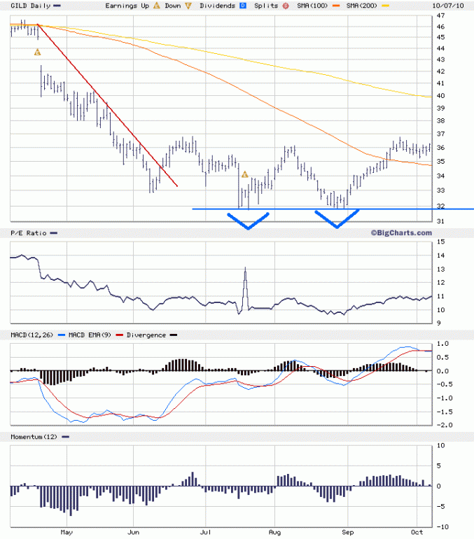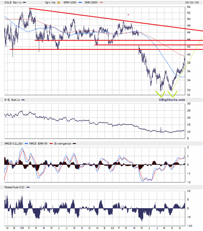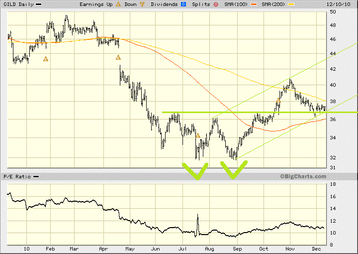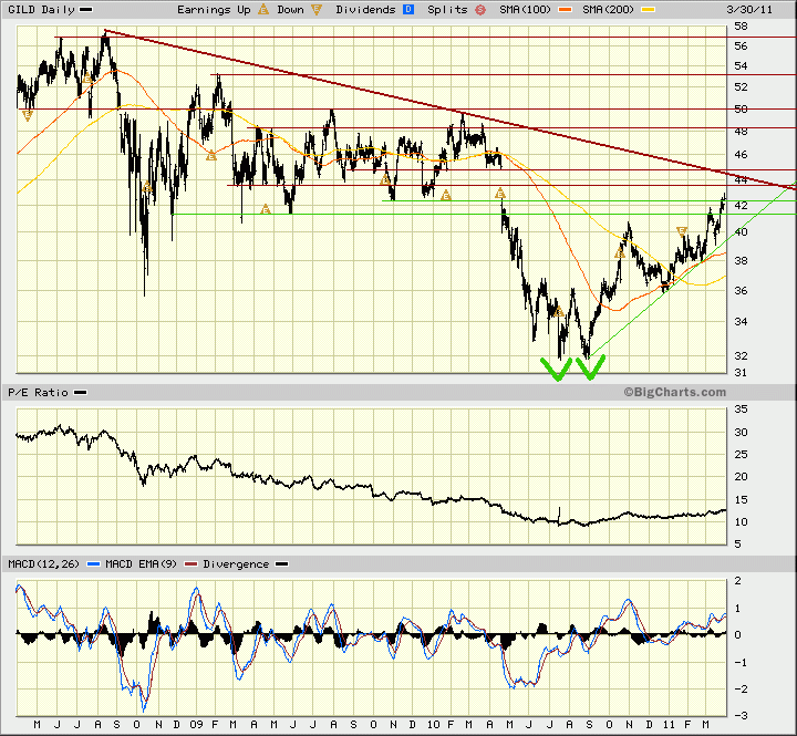 StockJunky März 31, 2011 Mir erscheint der Ausbruch über die 42 vom Volumen her halt relativ dünn. Das macht mir etwas sorgen. Ich befürchte, dass Gilead am 45-Dollar-Widerstand kämpfen wird und womöglich in einen Seitwärtstrend fällt. Mittelfrisitg rechne ich aber wieder steigenden Kursen, wenn das Unternehmen weiterhin mit Wachstum die Erwartungen erfüllt. Ein KGV von ca 10 halte ich für die Firma für sehr attraktiv. Wenn ich nicht schon investiert wäre, würde ich wohl jetzt einsteigen mit einem Stop-Loss unter 36. Diesen Beitrag teilen Link zum Beitrag