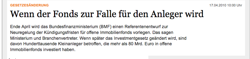 Was soll das hier bei den "Offenen immobilienfonds"? Das ist ein spezifisches Problem eines US-amerikanischen Fonds, der sich nicht bloß durch leveraging verspekuliert hat. Deren Problem war das sie etwas von T. Middelhoff gekauft haben. Goldman hat sich hier in die dubiosen Geschäfte der Herren T. und E. hineinziehen lassen. klarer Fall von kollusiven zusammenwirken und Interessenkonflikten - aber eben individuelles und nicht systemisches Versagen. Und hat mit OI nix zu tun.