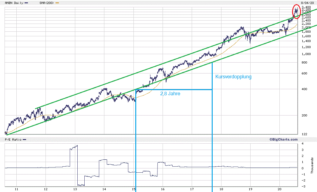 - Wer die Aktie schon hat, freut sich über das Grün im Depot, und sieht zwei Jahren seitwärts gelassen entgegen. Papa Bezos wird sich schon was einfallen lassen. Wir hatten heuer noch keinen Primeday, aber dennoch Umsatzrekorde. Das Optimieren von Margen hatte schon vor Corona keine Priorität. Dafür kann man bei Amazon darauf vertrauen, dass weiterhin ins Business investiert wird, und nicht in irgendwelche Tricks zur Margenoptimierung.