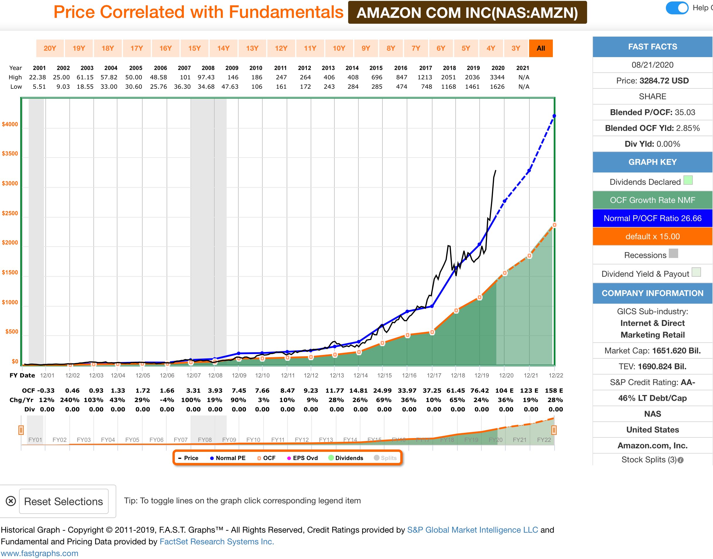 Wie ein anderer Forist ja schon zurecht bemerkte, hängt das ja wesentlich davon ab, welche Hochs und Tiefs du für deinen Kanal auswählst. Wenn man den Betrachtungszeitraum auf 20 Jahre ausbaut kann man ebenfalls einen Kanal finden, in dem die Aktie sich bis heute bewegt und den sie nur dreimal kurz verlassen hat: In der Internetbubble zur Jahrtausendwende und Anfang 2004 war sie überbewertet und Ende 2008 ganz kurz unterbewertet. Ansonsten bewegte sich der Kurs immer in einem Kanal, der eine Verhundertfachung innerhalb von ca. 16 Jahren bedeutet, bzw. eine Verdoppelung in ca. 2.5 Jahren. Und trotz dieses irrwitzigen Wachstums ist immer noch nicht erkennbar, dass das Unternehmen in seinen Geschäftsfeldern an seine Grenzen stösst. Das ist schon ziemlich verstörend...