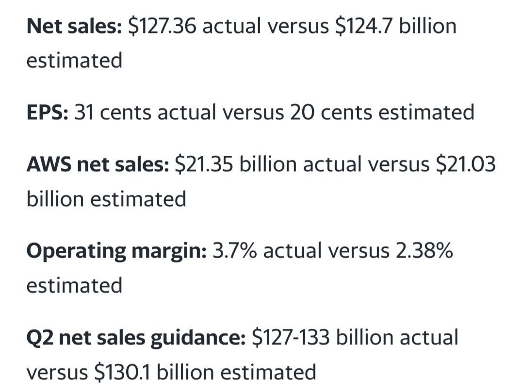 herbert_21 August 3, 2023 · bearbeitet August 3, 2023 von herbert_21 Amazon Quartalszahlen schlagen Erwartungen deutlich Net sales: $134.38 billion actual versus $131.63 billion estimated EPS: $0.65 versus $0.35 estimated Amazon Web Services (AWS) net sales: $22.14 billion versus $21.71 billion estimated Operating margin: 5.7% versus 3.46% estimated Operating income: $7.68 billion versus $4.72 billion estimated Q3 net sales outlook: $138 billion-143 billion versus $138.3 billion estimated In Q1, Amazon guided to Q2 net sales of $127 billion to $133 billion Diesen Beitrag teilen Link zum Beitrag