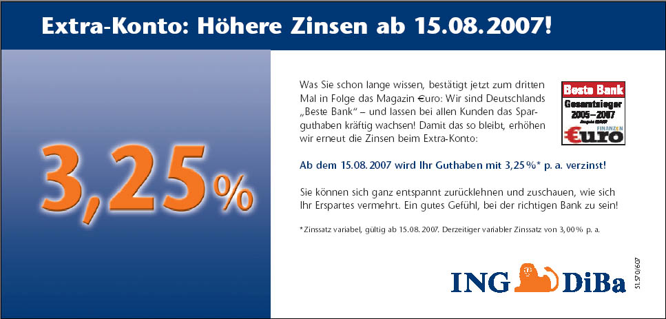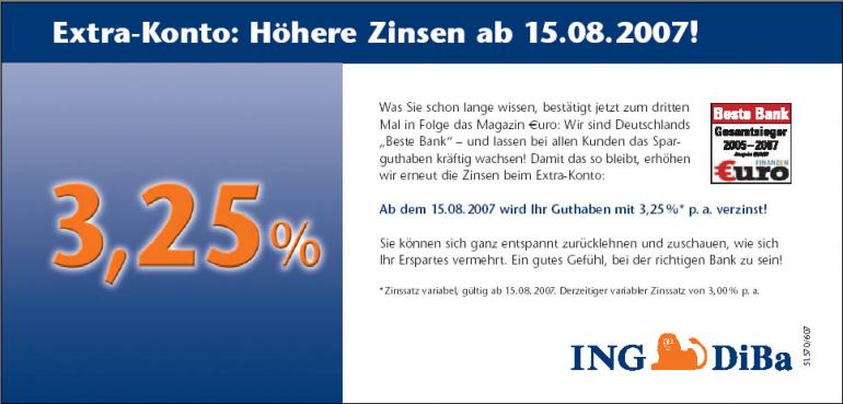 Wishmueller Juni 29, 2007 Hatte ich grad im Postfach..... ING Diba erhöht ab 15.08. von 3,0% auf 3,25% .... Geizhälse..... B) :-" Diesen Beitrag teilen Link zum Beitrag