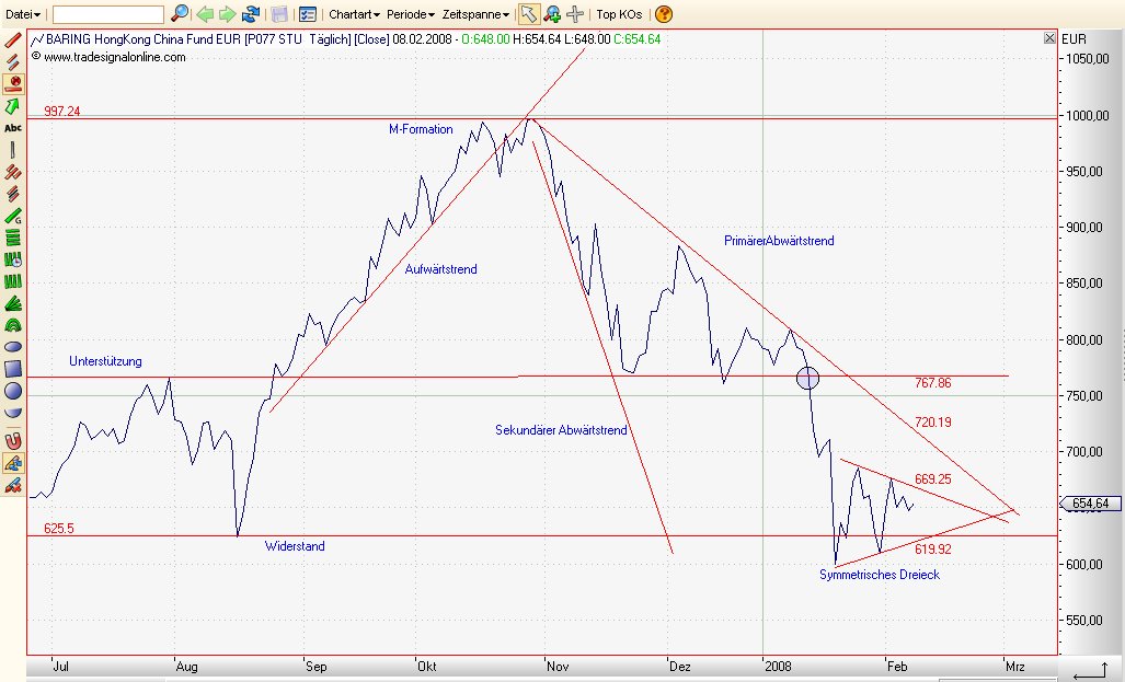 arguls Februar 10, 2008 · bearbeitet Februar 10, 2008 von arguls Was konnen wir schon sagen? Haengt davon ab wie mit DAX und Dow weiter geht. Wenn die Prognose fuer Dax weiter -15% Wahr wird, dann geht Baring satte 25-30% wieder in minus, denn die markte ist jetzt miteinander fest gelinkt. Und da optimismus fuer China ist weg, dann muss auch Hang Seng index trends in USA und Europa gehorchen, wobei Hang Seng faelt immer mit 2 mal groseren Geschwindigkeit in vergleich mit dax. Wenn Dax oder Dow berappelt, dann geht besser. Aber ich denke nicht dass da eine Rally fuer China Aktien geben wird, weil die Konjunkturdaten ist ziemlich negativ und wird regelmaesig Schockwellen ausloesen. Die meisten schlechten Nachrichten sind noch nicht veroffentlicht. So von einem Experten, der Interview in Bluemberg TV hat erwaehnt noch weitere 800 Milliarden EUR abschreibungen werden folgen. Dann konnen sie schon vorstellen wie die Zukunft fuer baring auschauen wird. Mit einem Wort ich bin selbst nicht sicher wie wirklich die Situation weiterentwickelt. Die Blase war ziemlich gross. Und daher ist es moglich, dass noch viel Luft drinn ist. Von anderer Seite gibt es noch China Regierung, die einmischen konnte wegen Olympischen Spiele, um gut auszusehen durfen die kein Crash zulassen. Wer weiss. Ich denke In Moment ist besser abzuwarten, dann kommen wir zum Bodenbildung etwas naeher als jetzt. Irgendwie glaube ich nicht, dass das Boden weit entfernt ist, aber das ist optimistiche Einschaetzung. Diesen Beitrag teilen Link zum Beitrag