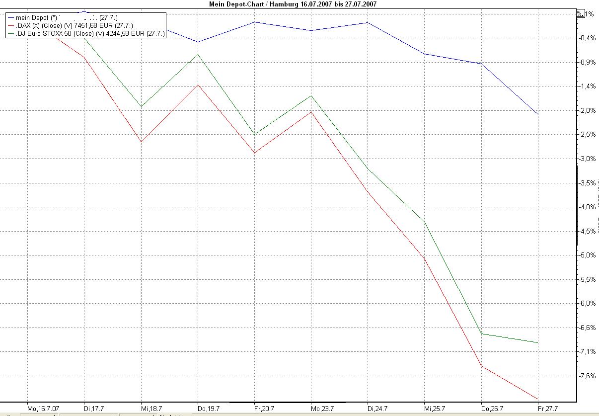 DAX43 Juli 28, 2007 für mich gibt es keinen Grund zu verkaufen. Mein konservatives Depot hat sich in den letzten Tagen ganz gut geschlagen. Minus 2% , also eigentlich nicht einmal eine Meldung wert. Wenns so richtig rauf geht mit den Kursen beneide ich die 100% Aktienanleger weil ich da nicht mithalten kann. Wenns aber mal heftig nach unten läuft schlägt die Stunde der vorsichtigen Anleger. DAX43 Diesen Beitrag teilen Link zum Beitrag