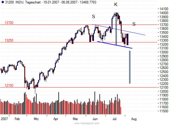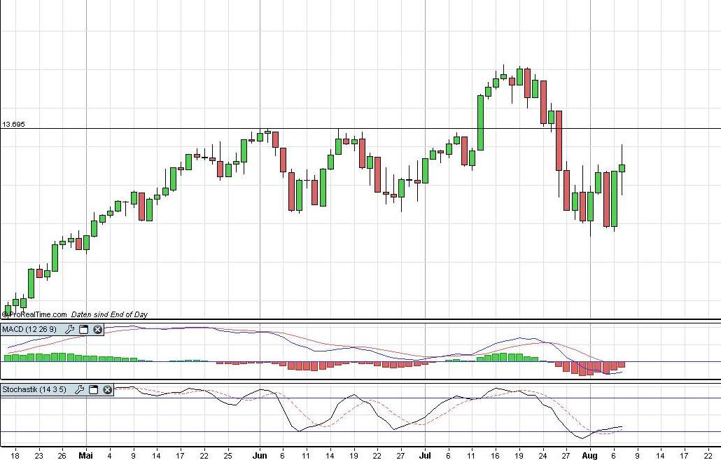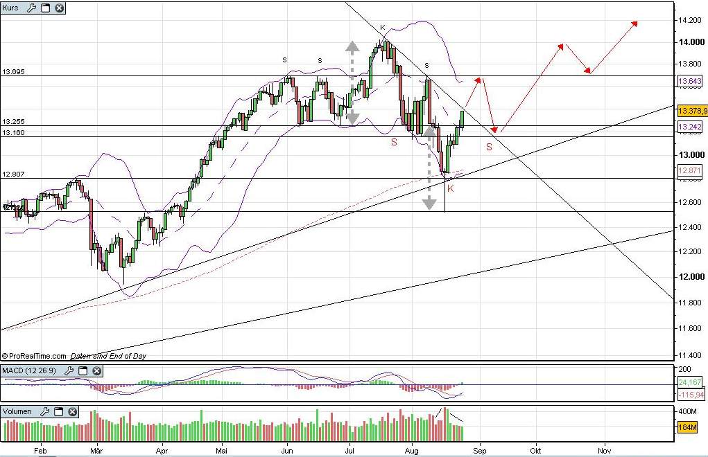 Ein Dreh an der kurzfristigen Abwärtstrendgeraden bei 13400 ist nicht ausgeschlossen. Evtl. sieht man dann einen Boden in Form eines Doppeltiefs oder irgend was anderes. Muss man dann sehen.