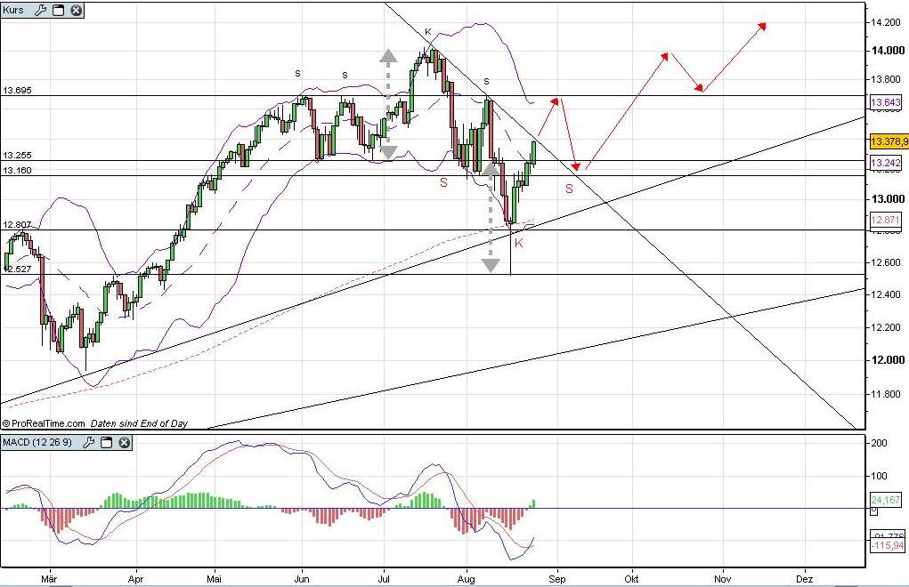 Also, Schlusskurs über 13400 eröffnet Kurspotential bis 13700. Dort sollte der Dow noch einmal dynamisch nach unten drehen, da es sich um einen ziemlich massiven Widerstand handelt. Kurziel 13160 mit Bildung der rechten Schulter. Sollte dem Dow dort der Dreh gelingen und auch die 13700 danach brechen, dann ist die Bodenbildung als S-K-S abgeschlossen.