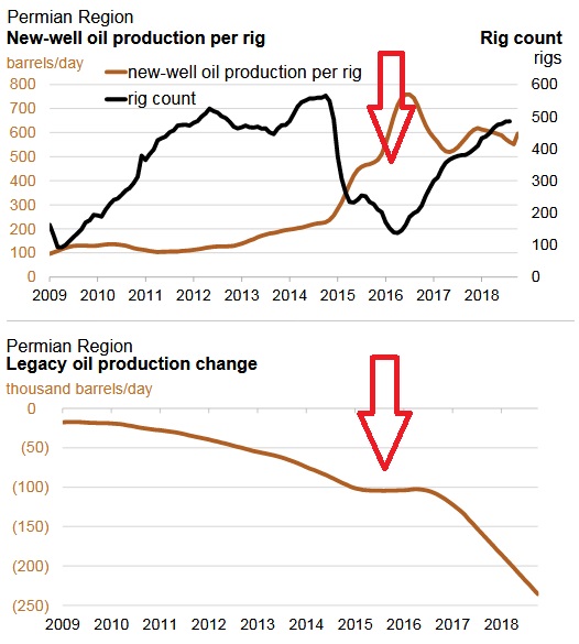 Trauerschwan Dezember 25, 2018 Dazu noch die Graphiken zum Permian vom letzten Drilling Productivity Report (Dezember 2018): Das letzte Mal, bei dem die Decline Rate konstant geblieben ist, war nach dem starken Ölpreisrückgang, der 2014 begann. Erkennbar ab 2015. Man könnte (fälschlicherweise?) daraus schließen, dass die Produktion momentan auch stagnieren könnte. EIA und andere Quellen widersprechen dem allerdings. Diesen Beitrag teilen Link zum Beitrag