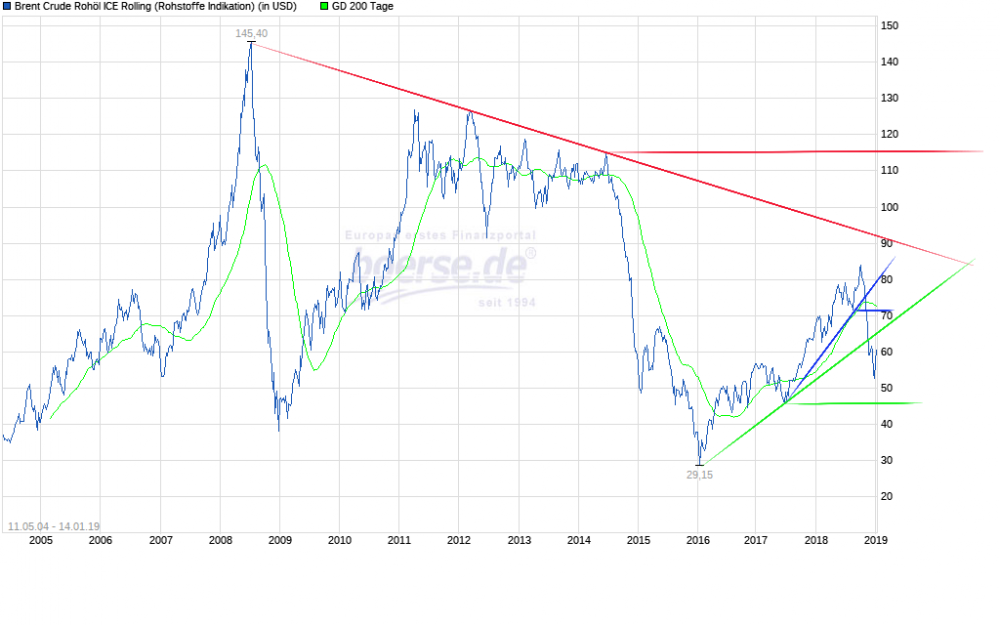 Aktiencrash Januar 14, 2019 Auf langfristige Sicht befindet sich der Rohölpreis (Brent) in einem stabilen Abwärtstrend (rot). Die Abwärtsdynamik ist seit 2008 relativ hoch. Die erste dynamische Abwärtsphase setzte 2008 bis 2009 ein. Die nächste Abwärtsphase setzte verlief von 2014 bis 2017. Am Zeitraum dieser Phasen erkennt man bereits die verringerung der Abwärtsdynamik. Bestand diese 2008/09 noch aus 6 Monaten, so hat sich die 2 Phase auf ca 1,5 Jahre (2014 bis 2017) verlängert. Mittelfristig sind beim Brent bereis alle Dämme nach unten gebrochen (grüne Aufwärtstrend). Betrachtet man die Sache kurzfristig, dann ist Brent mit unterschreiten der 70 $ Marke bereits völlig überverkauft. Seit dem Top 2018 hat sich hier eine hohe Eigendynamik in Richtung Süden ausgebildet, die sich jetzt aber im Bereich 50 $ abbauen wird (horiz. Linie grün). Dieser Damm wird noch einmal Käufer an den Markt locken um den schnellen Profit einzufahren, was den Preis für´s Brent noch einmal kurzfristig nach oben befördern wird. Indikatoren wie der Macd bauen für diese kurze Aufwärtsphase bereits pos. Divergenzen auf. Jetzt muß man nur noch abwarten bis nach erfolgter Bodenbildung sich ein Aufwärtstrend bildet und schauen wie lange dieser Aufwärtstrend Bestand hat. Mit viel Glück könnte Brent schon Ende 2019 bis Mitte 2020 den langfristigen Abwärtend (rot) erreichen. Diesen Beitrag teilen Link zum Beitrag
