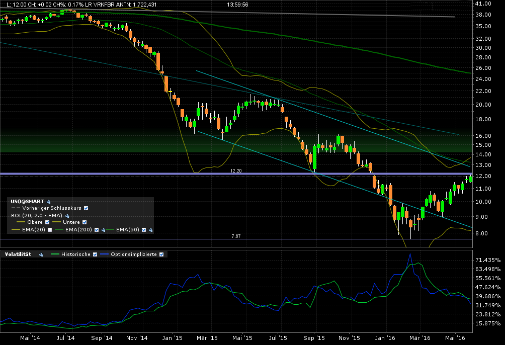 Cai Shen Mai 29, 2016 · bearbeitet Mai 29, 2016 von Cai Shen Ach, da sind noch ganz andere Kuriositäten versteckt: Wenn aus der Support- eine Resistance-Linie wird, ist ein nachhaltiges Überschreiten positiv zu sehen und führt mitnichten zum Ende des Aufwärtstrends. Aber gut, Charttechnik ist keine Wissenschaft und jedem das Seine, oder so. PS: IEA ist kein Medium, sondern Fachgremium. Ich hätte da auch einen Chart im Angebot, durch die Rollverluste steht der Ölfonds noch nicht ganz so hoch wie Öl zum Spotpreis - gerade exakt unterhalb der Resistance. MACD gibt sowohl im Linienverlauf als auch Histogramm ein weiterhin positives Bild, RSI bei knapp 60 sehe ich nicht so kritisch - der Indikator ist mir aber generell wurscht. Die Vola sinkt auf Tiefstwerte, damit ist gerade nicht viel Unruhe im Markt anzunehmen. Abseits des ganzen Voodoo, nächste Woche ist OPEC - Sitzung, das ist weit gefährlicher als falsch gezogene Linien im Chart Diesen Beitrag teilen Link zum Beitrag