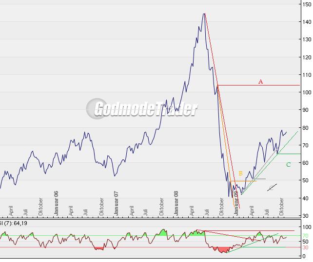 Aktiencrash November 22, 2009 Hier meine neuste Einschätzung zu Rohöl der Sorte Brent. Es haben sich nach dem Absturz von ATH 2008 ein langfristig primärer Abwärtstrend mit horiz. Widerstand A und ein sekundärer Abwärtstrend mit horiz. Widerstand B gebildet. Im Feb/März. 2009 hat Rohöl den Angriff auf den sekundären Widerstand B vorgenommen und diesen auch durchbrochen. Somit existiert nur noch der primäre Abwärtstrend (rot) ink. horiz. Widerstand. Bei Durchbruch des horiz. Widerstandes B hat der RSI eine pos. Divergenz (grün) ausgebildet, die nun im Einklang mit dem Kurs zu pos. Konvergenz übergegangen ist. Es hat sich ein primärer Aufwärtstrend (grau) ausgebildet, der sich nach dem Trendbruch verlagert hat (jetzt grün). Der horiz. Widerstand (C nach C) wandert ebenfalls nach oben. Fazit: Langfristig (5-8 Jahre) dürfte Rohöl die Marke des jetzigen horiz Widerstandes (A) nicht mehr überschreiten. Die Aufwärtsdynamik ist zur Zeit eher schwach, da der RSI zwischen 50 und 70 pendelt. Mittelfristig sehe ich den Höchstkurs zwischen 80 und 100 $ liegen, bevor der primäre Aufwärtstrend samt horiz. Unterstützung bricht. Diesen Beitrag teilen Link zum Beitrag