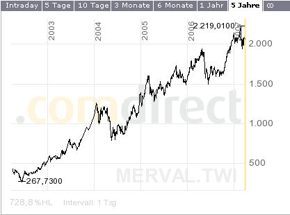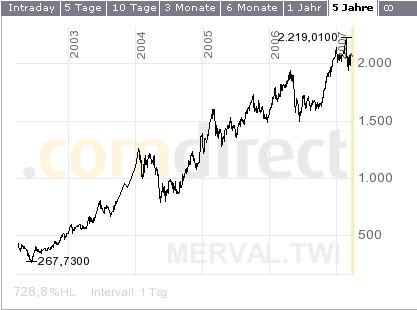 DerFugger März 29, 2007 Am besten, man hätte in den letzten Jahren gleich in argentinische Aktien des Mervall investiert. Da hätte man ordentliche Rendite gehabt und bei einem Index-Zertifikat auf den gesamten Mervall eine viel größere Sicherheit als bei den fragwürdigen Anleihen. Diesen Beitrag teilen Link zum Beitrag