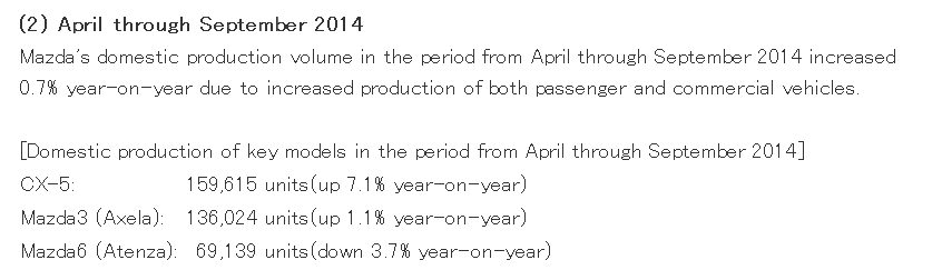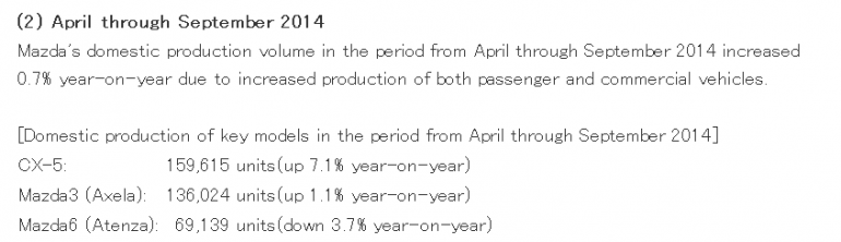 Dandy November 1, 2014 @Laser Persönliche Erfahrungen sind natürlich nicht verkehrt, aber sollten nicht ausschlaggebend für den Kauf einer Aktie sein. Die Kooperation mit Ford führte zu Qualitätsproblemen, das behaupten jedenfalls viele. Insbesondere mit Rost hatten die Modelle Anfang-Mitte 2000 stark zu kämpfen, was zu hohen Reklamationskosten für Mazda geführt hatte. Von diesen Problemen ist aber heute überhaupt nichts mehr zu lesen und die Kooperation mit Ford ist beendet. Vermutlich ist das gut so. Was die These angeht, kleine Autohersteller hätten global keine Chance mehr zu überleben wurde das kürzlich erst im Economist hinterfragt. Es sind zur Zeit gerade die kleinen japanischen Autohersteller, die ihren großen Konkurrenten davonrennen. Hyundai hat meiner Meinung nach seinen Lauf gehabt. Die Autos sind zu bieder und spartanisch ausgestattet um mit Mazda mitzuhalten. Vielleicht ändert sich das noch, momentan kann ich das aber nicht erkennen. Ist aber sicherlich auch Ansichtssache. Hier noch ein paar Fakten zu den Verkaufszahlen nach Ländern: Nach Modellen aufgeschlüsselt sieht es aktuell (letztes Quartal) so aus: Produktion Japan: Produktion Ausland: Man sieht, dass insbesondere der Mazda Cx-5 und der Mazda 3 zum Zugpferd geworden sind. Generell sind aber alle neuen Skyactiv Modelle sehr erfolgreich. Das Design und die Qualität scheinen viele zu überzeugen. Aus dem Mund der Geschäftsführung klingt das im Quartalsbericht so: Retail volume by market was as follows. In Japan, retail volume was 90 thousand units, down 18.2% year onyear, due to the effect caused by the recent changes in the consumption tax rate, etc. However, all-new “Mazda Demio (called Mazda2 in overseas markets)”, which we introduced in September this year, has received recognition, being named the “2014-2015 Car of the Year Japan”, and its orders are off to a strong start. In North America, retail volume was 226 thousand units, up 13.6% year on year mainly due to increased volume in the U.S., where in addition to the contribution of all-new “Mazda3”, “CX-5” and “Mazda6 (called Mazda Atenza in Japan)” have maintained strong sales. In Mexico, we achieved record sales for the first six months. In Europe, all-new “Mazda3” drove sales and sales in Germany and the United Kingdom far exceeded the growth of the industry. As a result, retail volume was 114 thousand units, up 18.4% year on year. In China, retail volume was 94 thousand units, up 18.8% year on year, due to the strong sales of “CX-5” as well as commencement of the full-scale sales of all-new “Mazda3”. In other markets, retail volume was 145 thousand units, down 1.1% year on year, mainly due to the influence of a decline in demand in Thailand. Diesen Beitrag teilen Link zum Beitrag